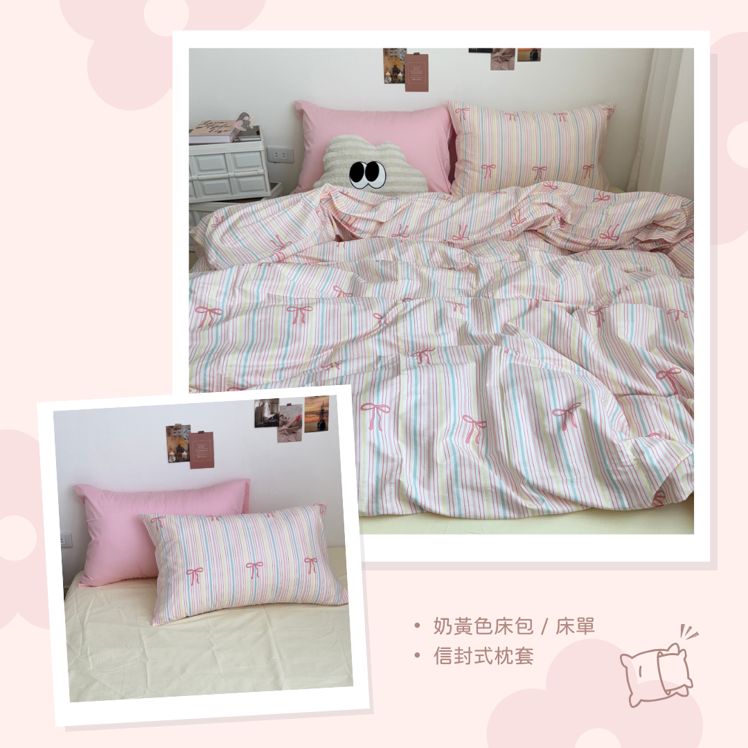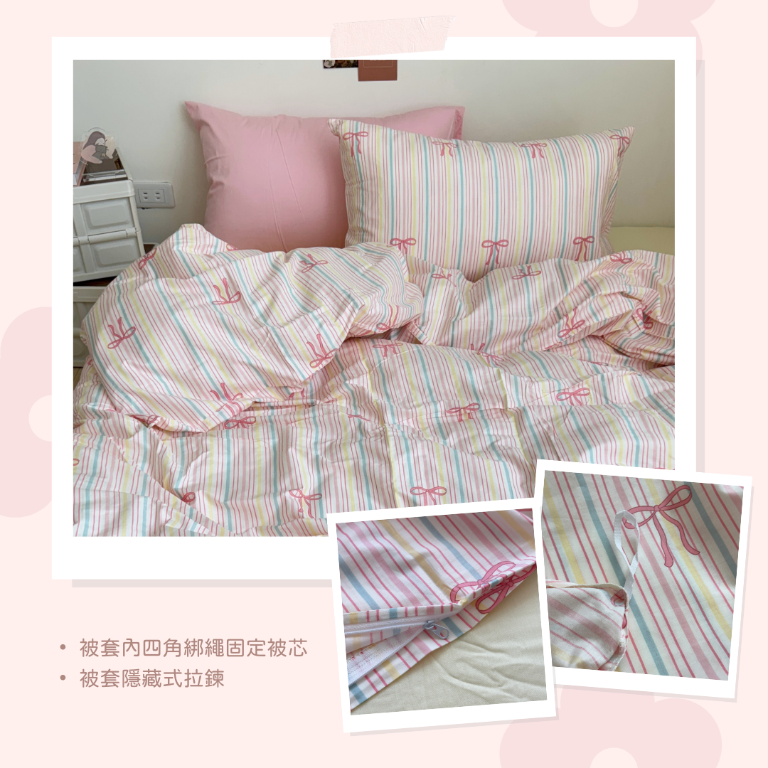 粉嫩條紋蝴蝶結純棉床組